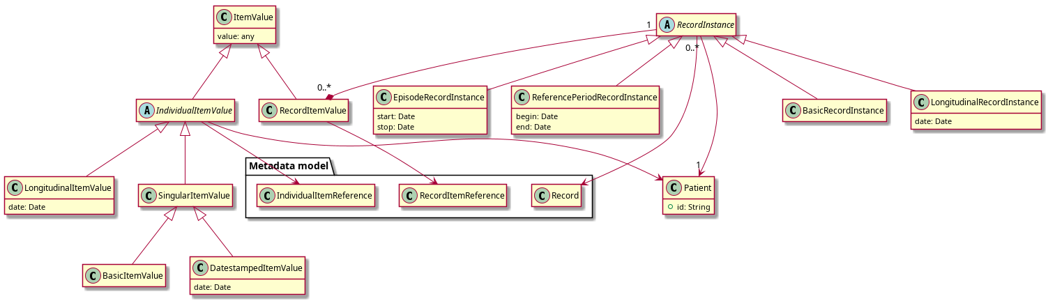 - For each patient and each longitudinal item reference, there may exist any number of item values, and the respective datestamp is included in the data model.
